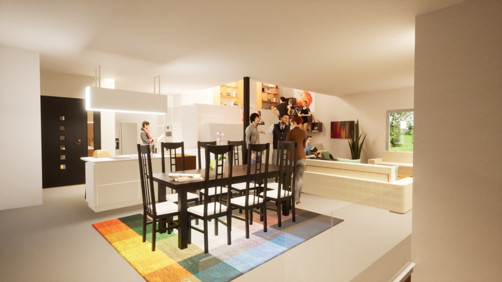La vivienda está ubicada al final de la calle Llamas, en la urbanización Ciudalcampo, en San Sebastián de los Reyes, en una parcela con desnivel moderado, adaptándose a la topografía y al arbolado existente. Es una vivienda con cubierta escalonada, vegetal para mejorar el confort térmico, transitable en toda su superficie, se puede recorrer y jugar de manera ilimitada.Las fachadas con orientación al oeste son ventiladas y cuentan con una celosía para tamizar el excesivo asoleo. Las orientaciones sur y este se resuelven con una cubierta escalonada, que actúan como lamas de gran dimensión. La vivienda cuenta con salón-comedor-cocina, sala de cine-lectura, cuatro dormitorios, cuatro baños, un apartamento independiente, taller, zona de aparcamiento y cuarto trastero y de instalaciones. Es una vivienda de consumo energético casi nulo, cuenta con un sistema de climatización por suelo radiante-refrigerante, mediante aerotermia y un sistema de ventilación mecánica controlada con recuperador de calor.