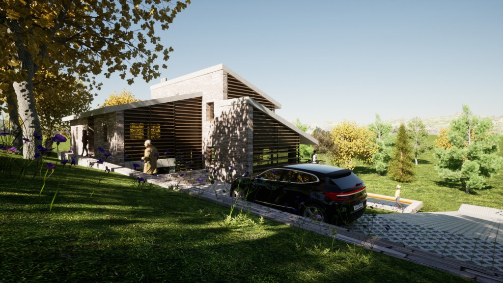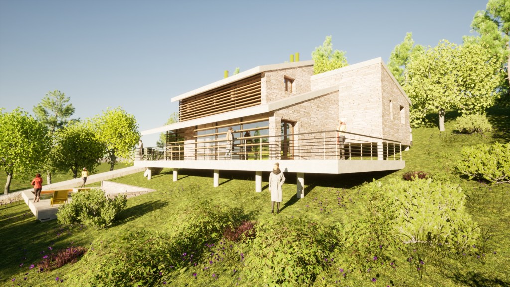 La vivienda se ubica en una parcela con una topografía con desnivel, orientada hacia el sureste, que disfruta de buenas vistas. Se distribuye mediante medias plantas, en tres niveles, adaptándose a la topografía de la parcela, distribuyéndose en el nivel superior o de acceso que cuenta con hall, cocina con office, dormitorio, baño y cuarto de instalaciones; en el nivel inferior cuenta el salón-comedor con terraza perimetral e invernadero; en el nivel superior dispone de dos dormitorios y un baño. El cerramiento de fachada se prevé mediante sistema “Sate”, proporcionando un óptimo aislamiento térmico, revestido en algunas zonas con aplacado de piedra natural. En las fachadas orientadas al sur se ha diseñado un cerramiento que funciona como «muro trombe», así como una zona de invernadero comunicada con el salón-comedor, mediante los cuales se consigue un acondicionamiento de la vivienda de forma pasiva. El sistema de calefacción-refrigeración se basa en un sistema de aerotermia. En la cubierta se ha previsto un acabado de teja cerámica plana, con un sistema de cubierta ventilada. Mediante la optimización del funcionamiento energético del edificio, se consigue una vivienda bioclimática, de consumo muy reducido.