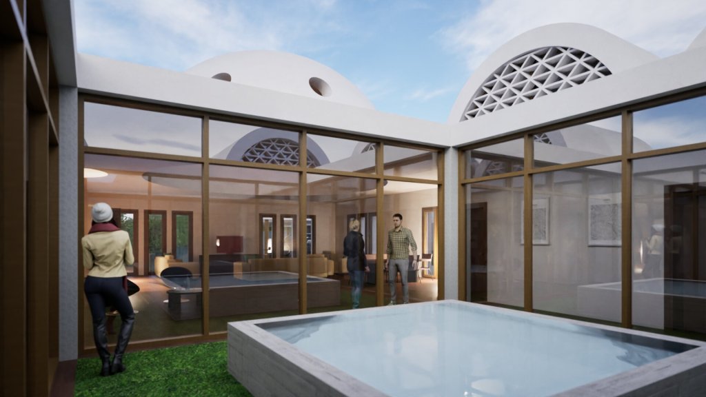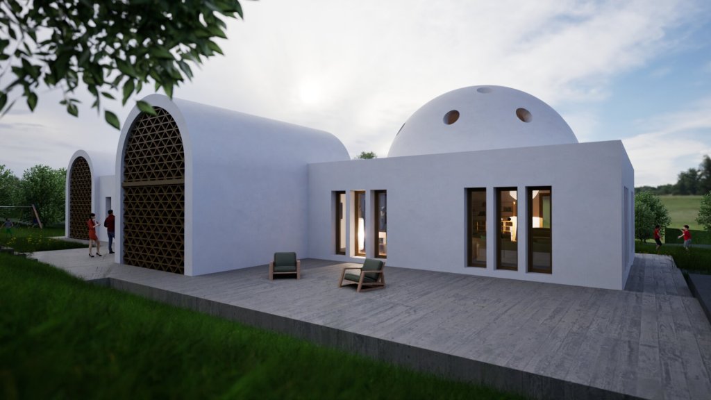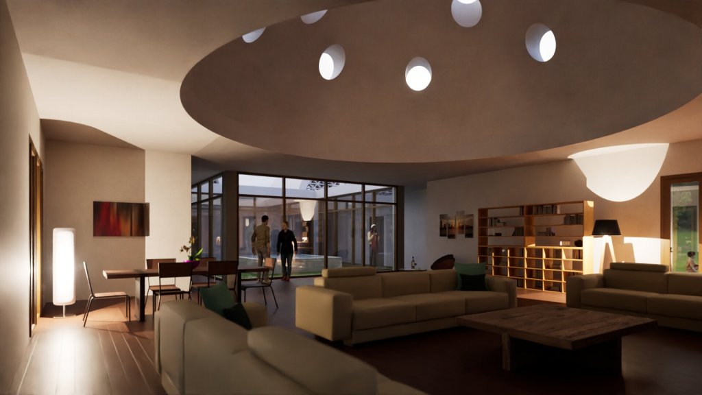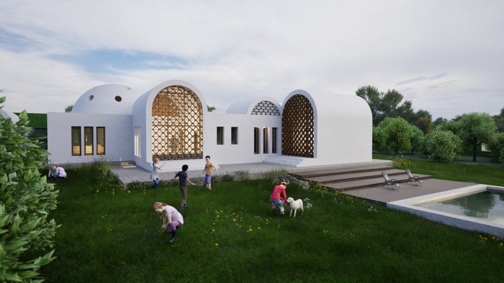 Se distribuye en una única planta y dispone de amplios espacios interiores, con alturas interiores generosas, mediante el empleo de la bóveda de medio cañón en dormitorios y de una cúpula en el salón. Sus fachadas alternan las zonas ciegas de color claro con celosías de madera, que le proporcionan privacidad, tamizar la luz solar así como ventilación natural cruzada durante los meses de verano. Cuenta con un patio interior que, a través de una lámina de agua, contribuye a reducir la temperatura ligeramente durante los meses de verano.